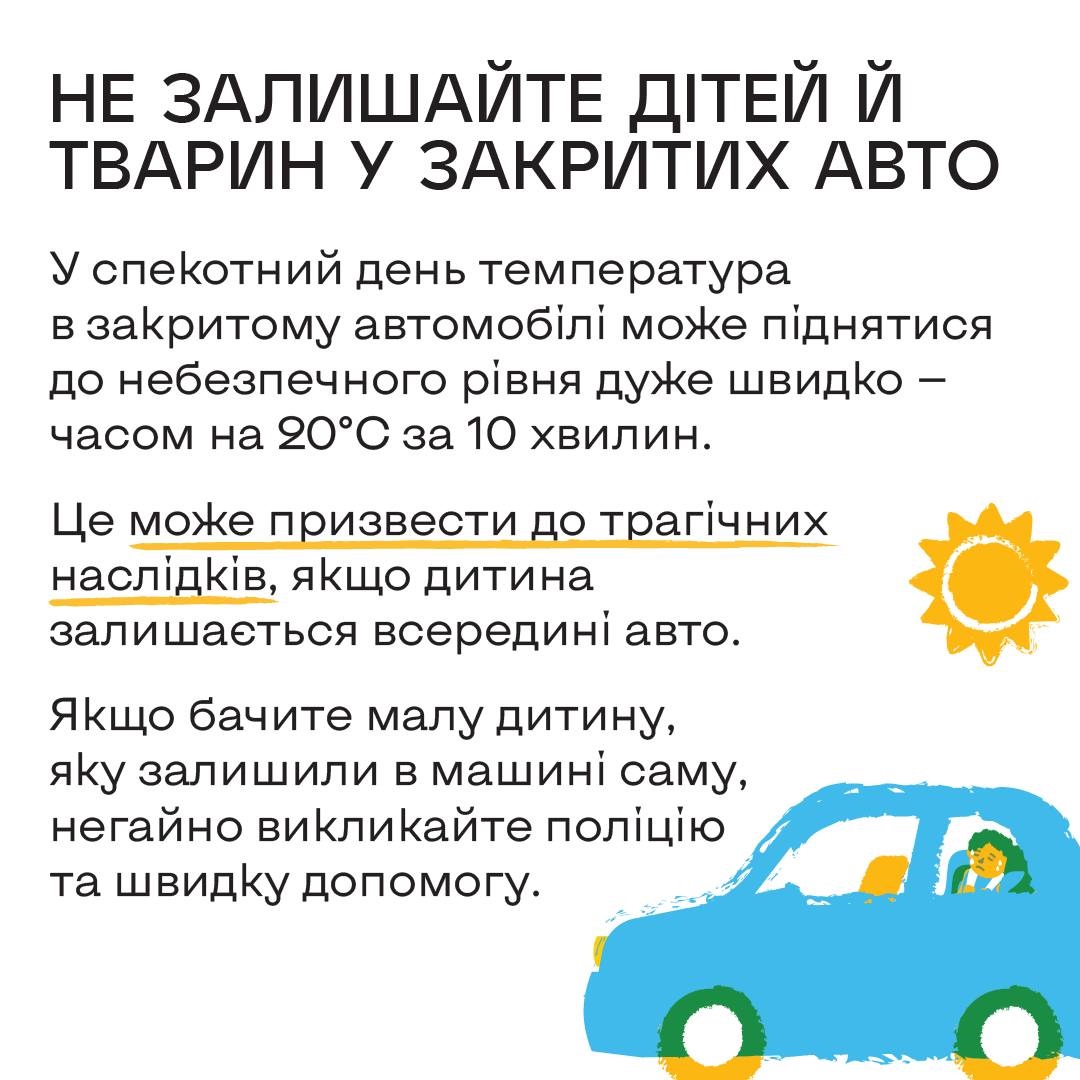 - Якщо бачите дитину, залишену саму в автомобілі, негайно викликайте поліцію. Ваші дії можуть врятувати життя.