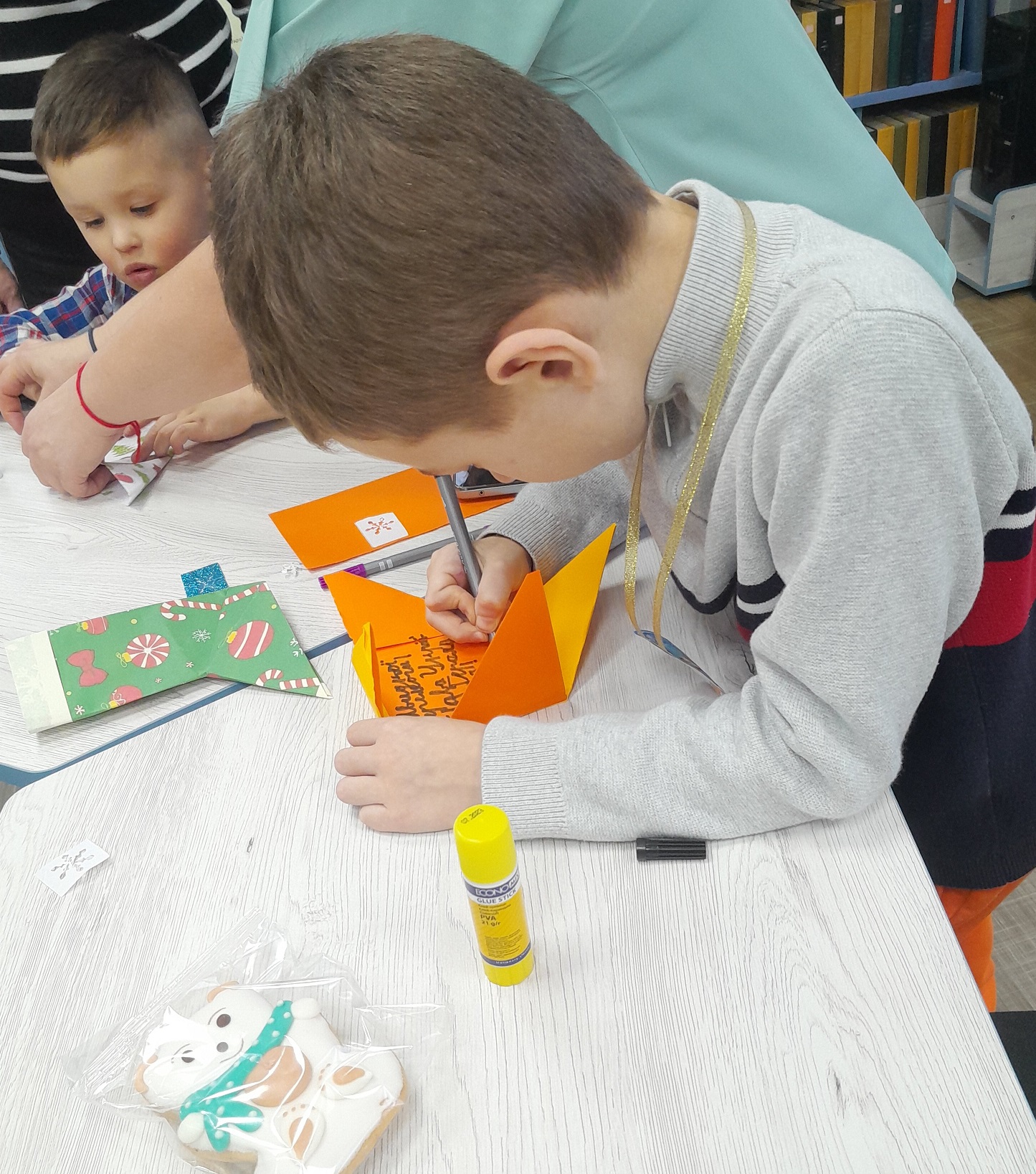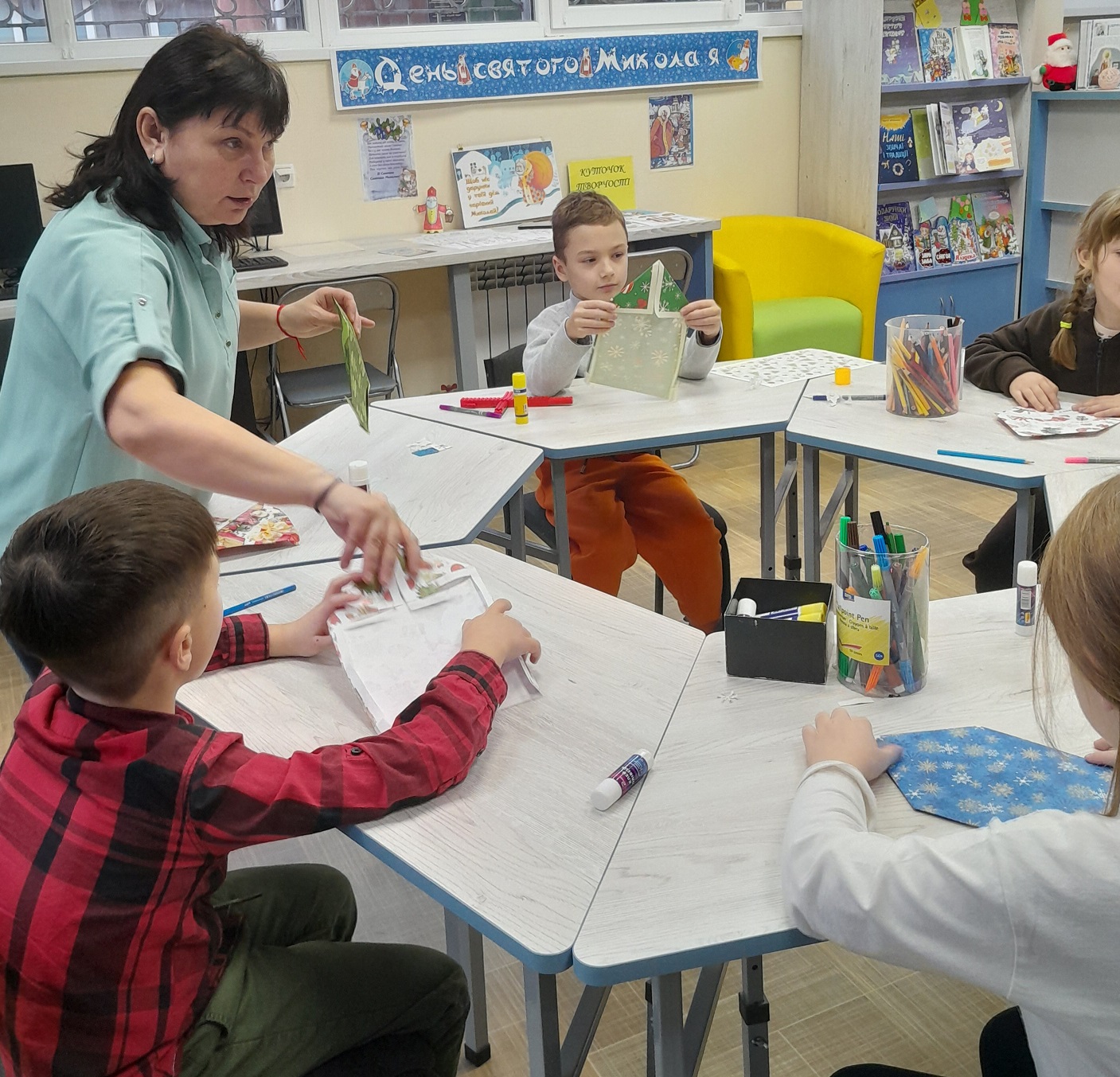 Особливо яскравим моментом став майстер-клас з оригамі «Чобіток для Подарунків Миколая». Маленькі читачі з захопленням складали яскраві паперові чобітки, старанно підбирали кольори, прикраси та деталі. Для багатьох діточок це був перший досвід роботи з оригамі — і вони впоралися просто чудово! Під час майстер-класу діти допомагали одне одному, ділилися ідеями, пишалися своїми результатами. Ми бачили, як у їхніх очах з’являлося те саме свято — щире й світле.
