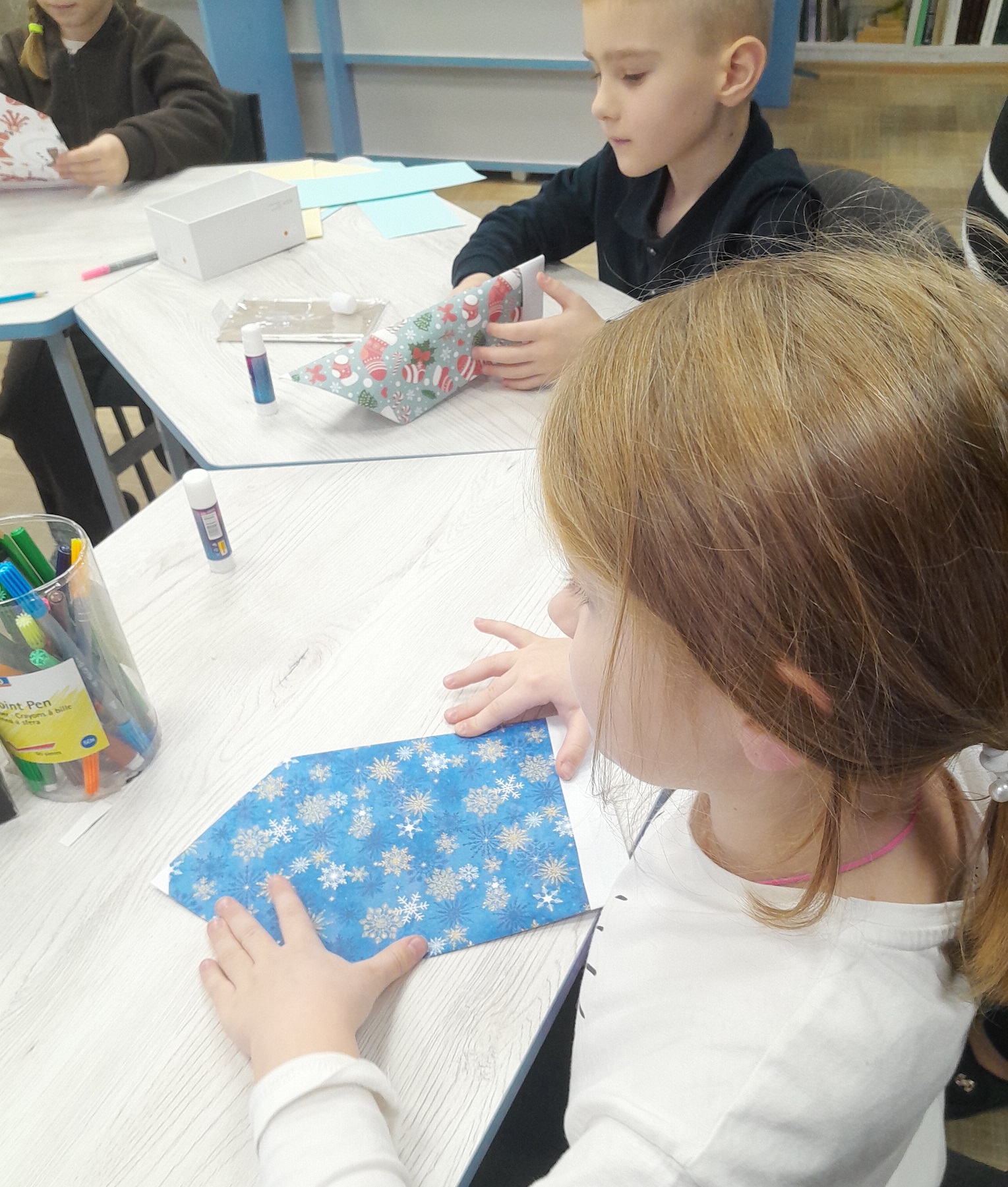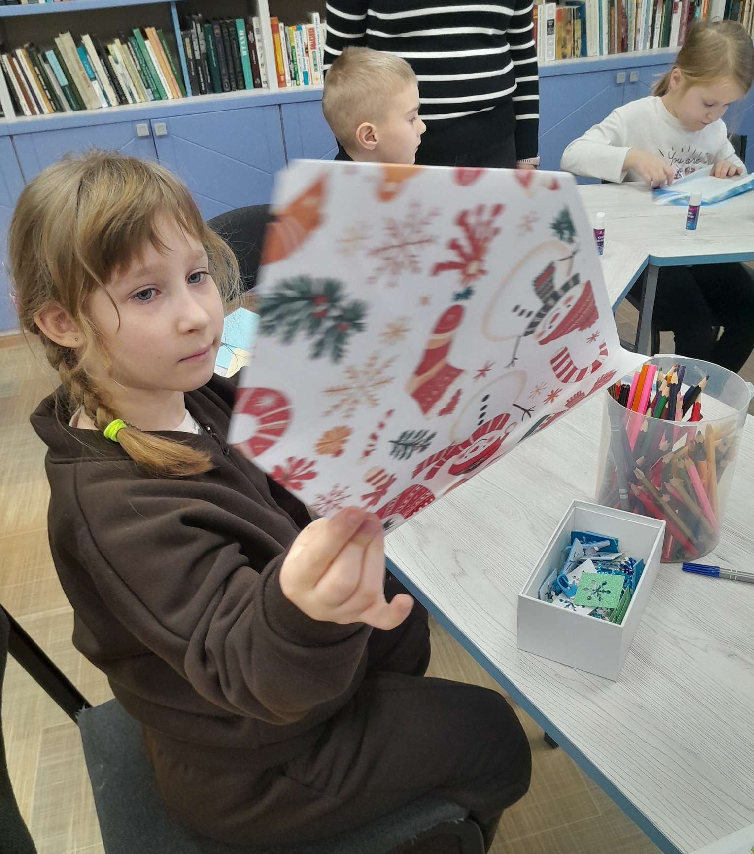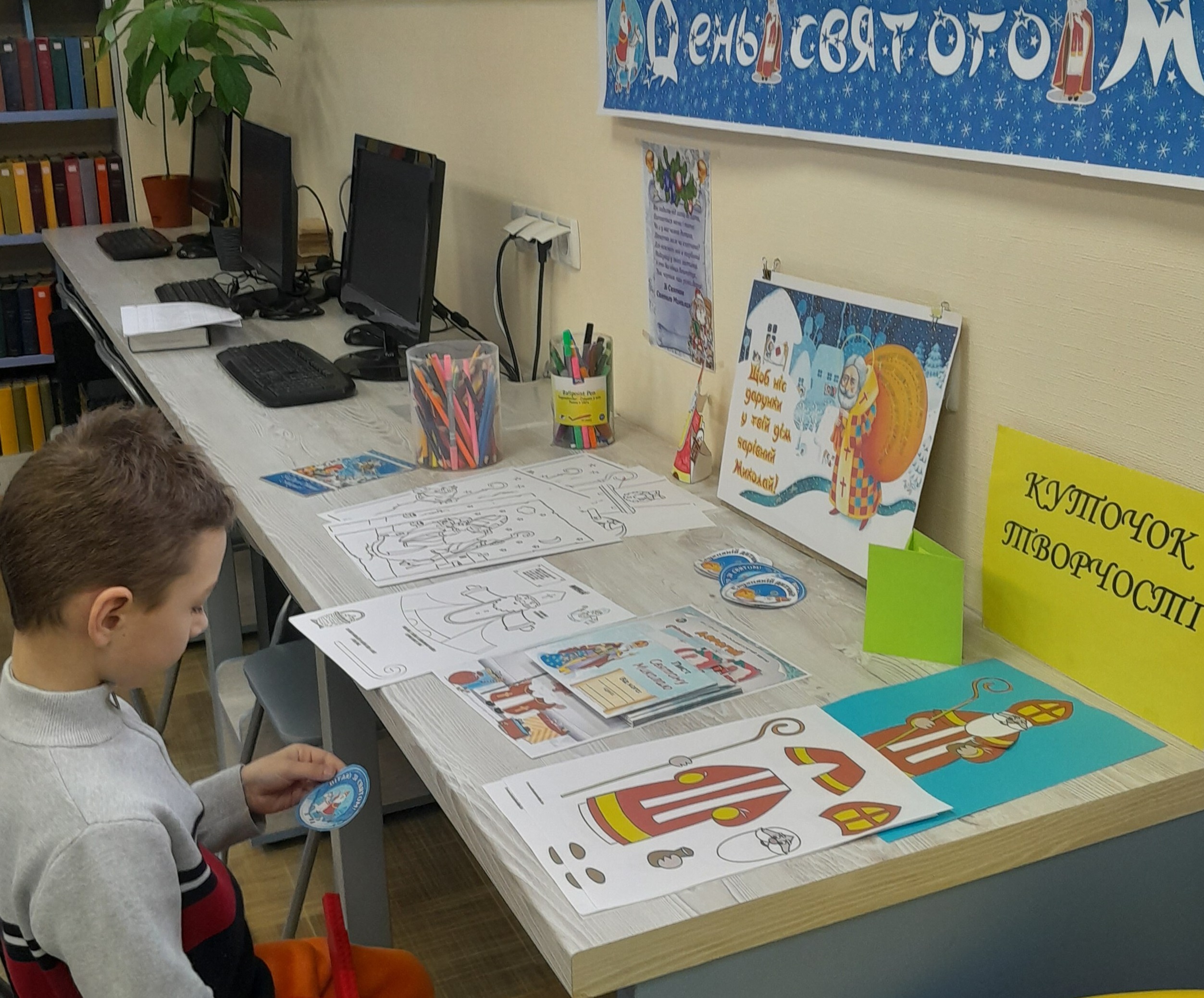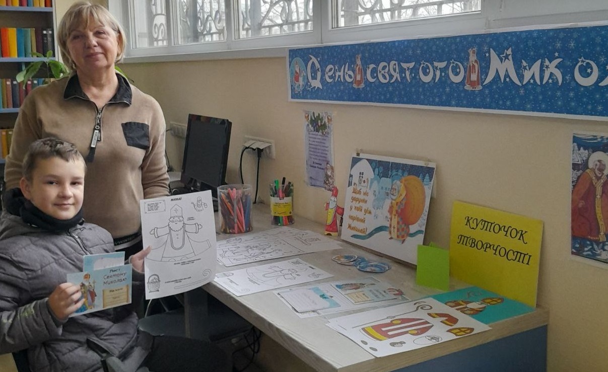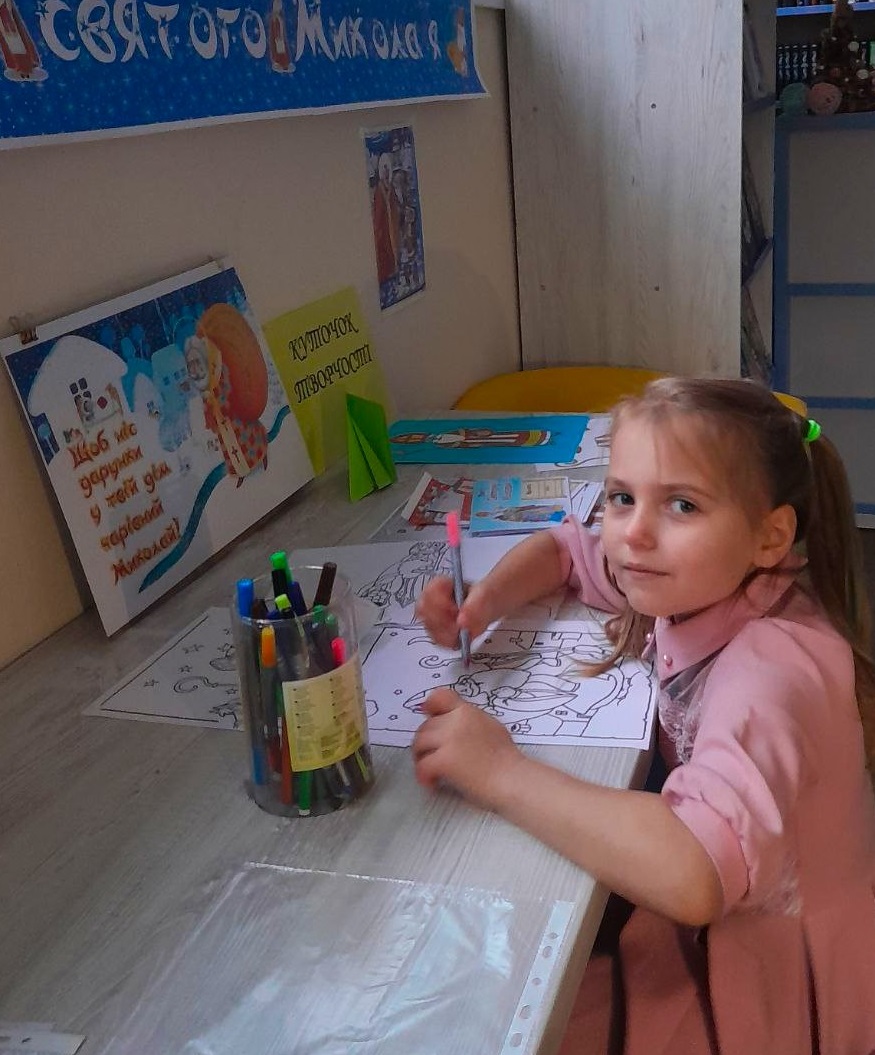 В творчому куточку малеча могла дати волю своїй фантазії. Писала листи Святому Миколаю, створювала аплікації, новорічні поробки, розмальовувала зимові картинки — просто в бібліотеці або забирала додому, щоб зробити творчість сімейною традицією.