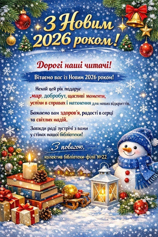 Бібліотека-філія № 22 вітає всіх з Новим 2026 роком! Нехай Новий рік принесе мир, добробут та нові відкриття. Хай ваші книжкові полички завжди будуть сповнені цікавих історій, а серця - жагою до знань!