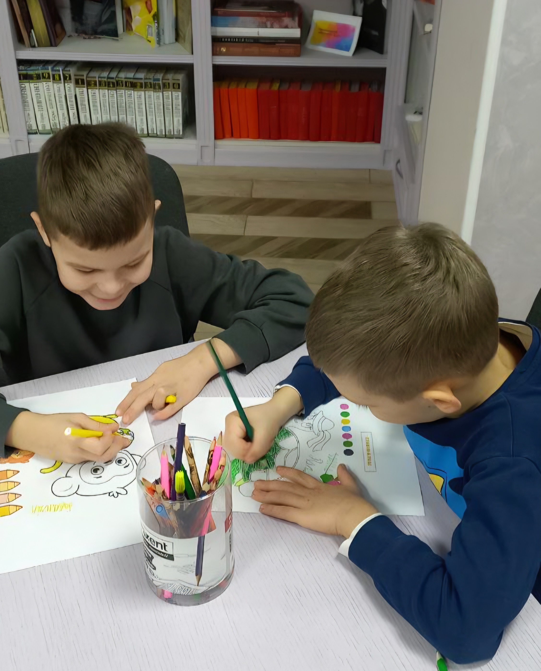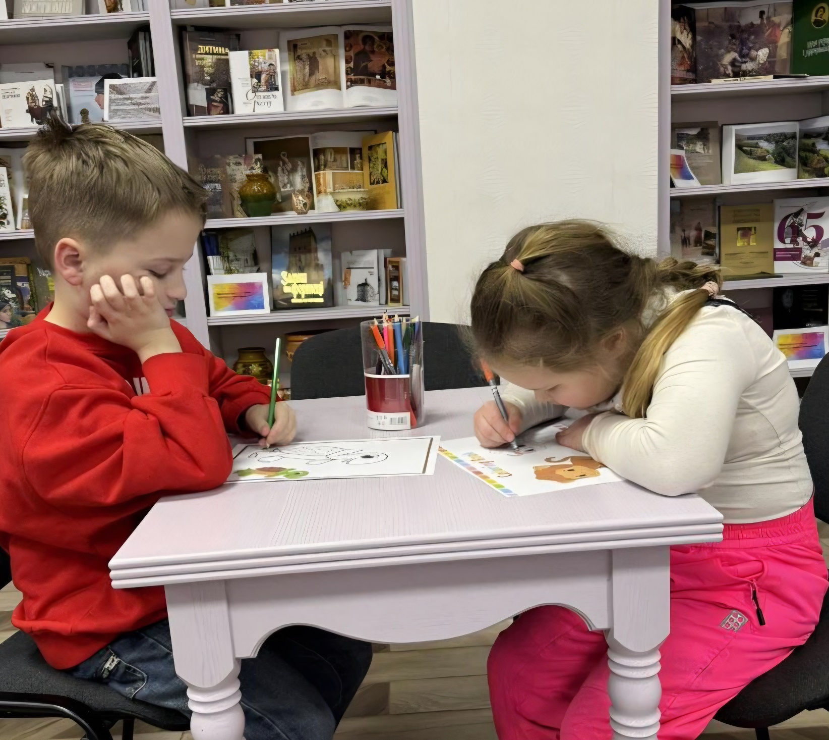 Малятам представили ще дві книжечки письменниці – «Біла казка» та «Веселі хтосики». Загадки з останньої збірочки дружно розгадували пізнайки, особливо їм припали до душі кумедні загадки-побрехеньки, а ще залюбки слухали віршики про тваринок, пори року, явища природи тощо. Переглянуті мультики-пісеньки «Веселі баранці» та «Мавпа мавпі говорила» змусили непосидьок не тільки підспівувати, а ще й пританцьовувати. Тож до творчої роботи з розмальовками вони взялися із задоволенням – яскравими барвами розфарбували черепашок і мавпочок. Навіть придумали імена цим тваринкам.