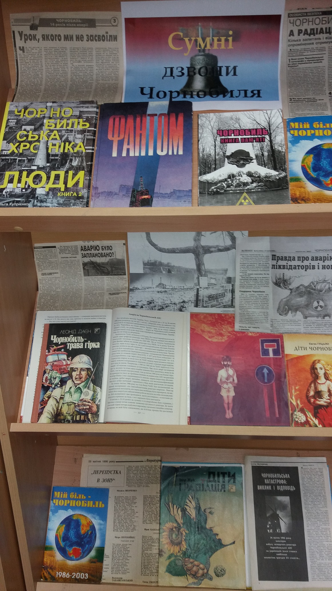 На виставці представлені також статті із газет, що висвітлюють трагедію Чорнобиля та розміщені портрети пожежників, що першими стали на захист країни від радіації. Про дітей Чорнобиля розповість книга Євгена Гуцала «Діти Чорнобиля». Це не повинно повторитись!!!