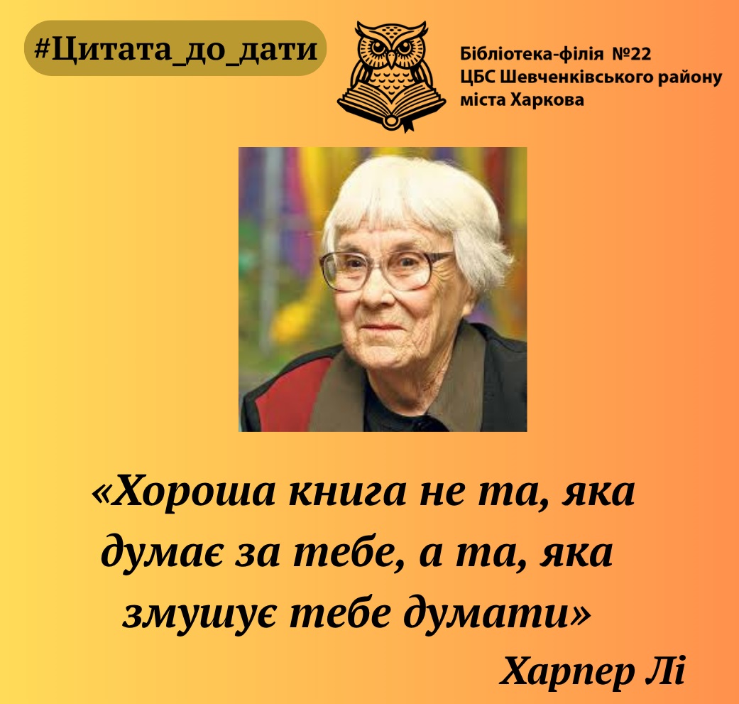 28 квітня відзначається 100-річчя від дня народження Нелл Гарпер Лі, американської публіцистки і прозаїка. До цієї дати у Бібліотеці-філії №22 відбулась літературна бесіда, яка познайомила присутніх з життям і творчістю письменниці. Читачі також мали можливість подивитися буктрейлер «Все, що вона хотіла сказати світу…» за її романом «Вбити пересмішника».