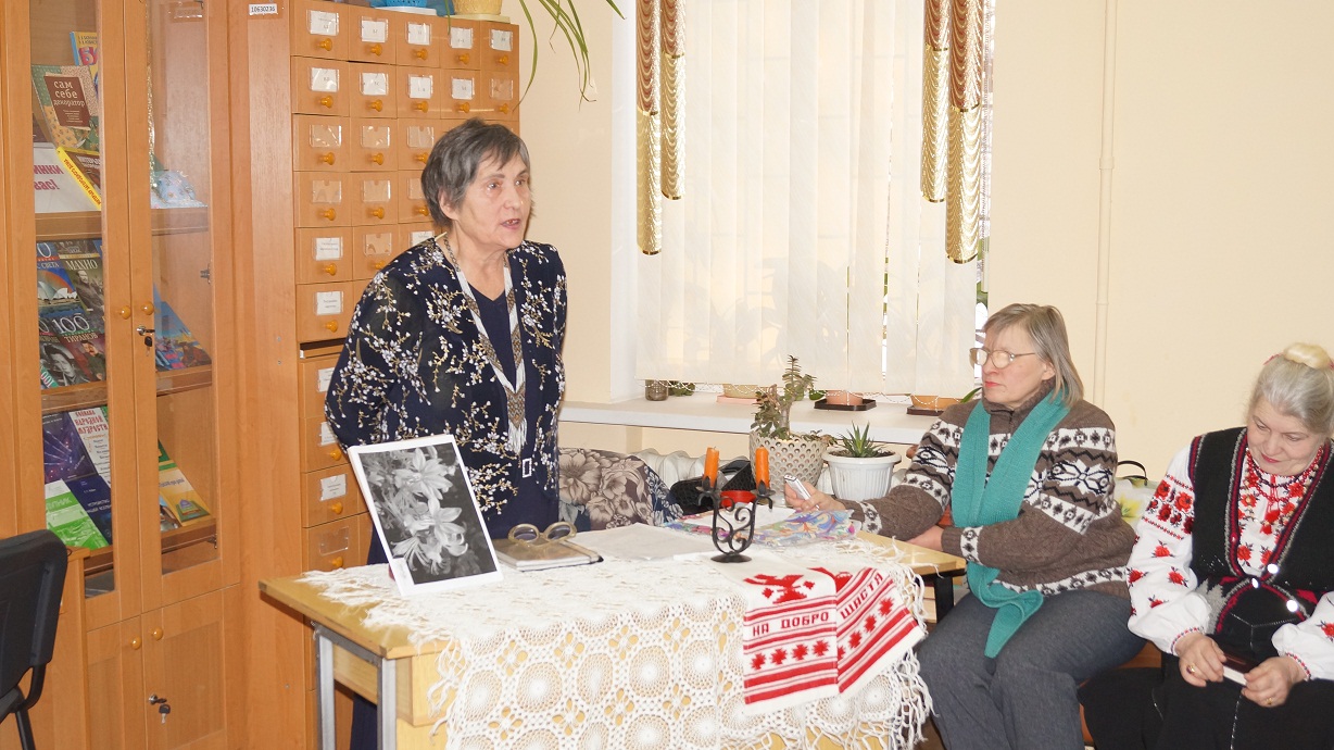 Тетяна Михайлівна познайомила присутніх з традиціями народної вишивки України і Слобожанщини, розповіла про обереги і символіку вишивки, читала свої вірші. Свої розповіді вона проілюструвала відео з особистого архіву: записами інтерв'ю для 7 каналу і програми «Надвечір'я».