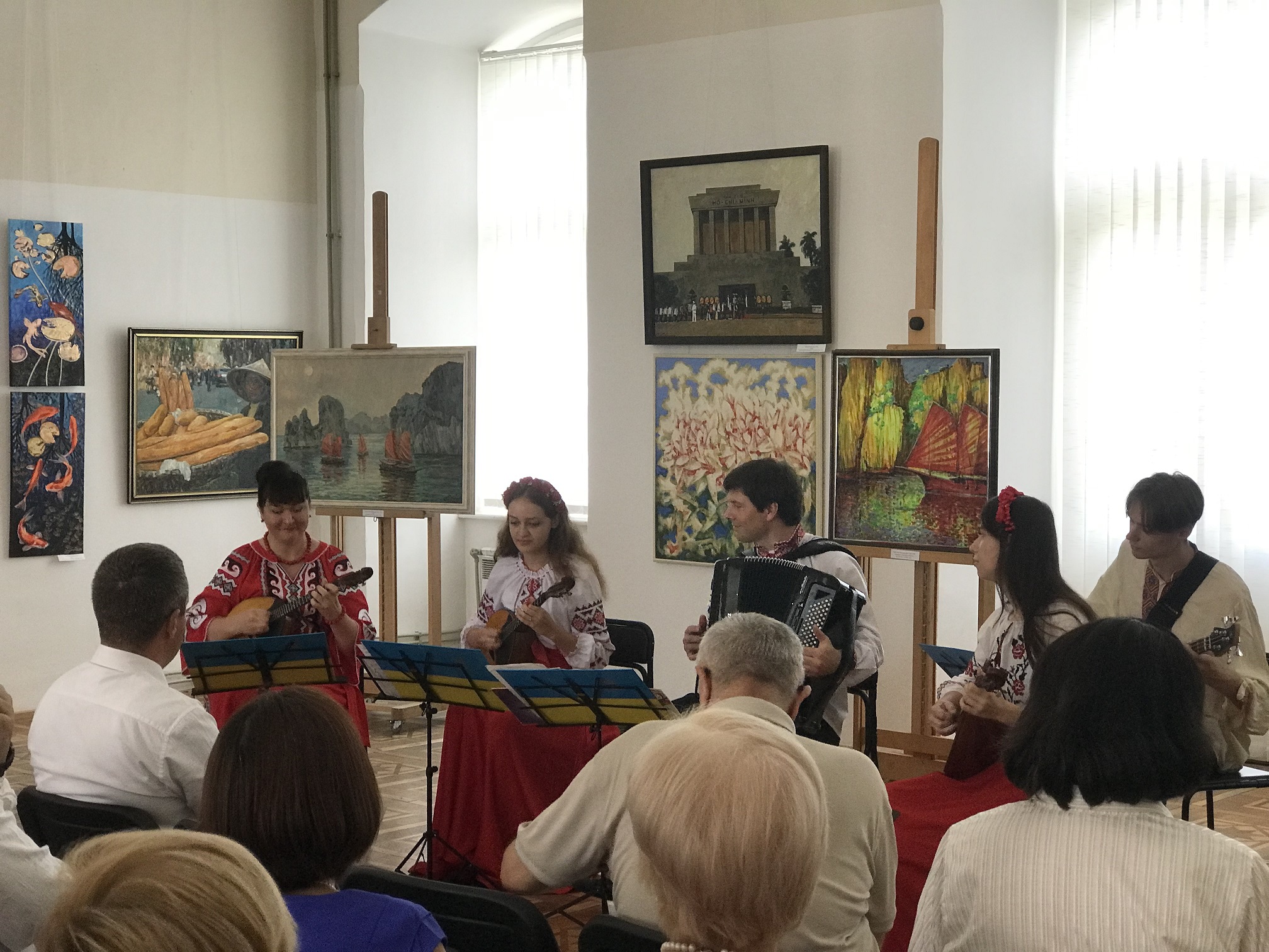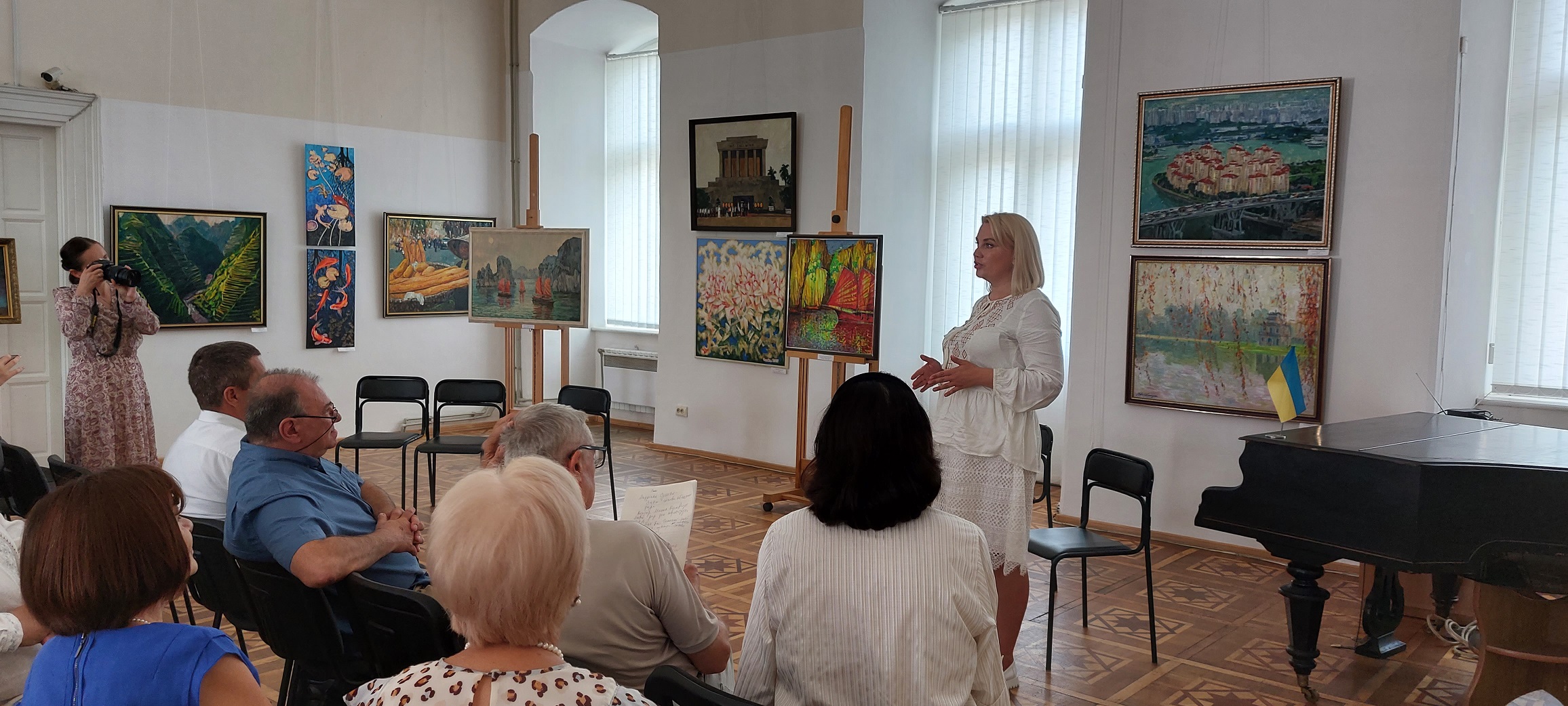 Головний бібліотекар Центральної міської бібліотеки ім. В. Г. Бєлінського Ганна Абрамова від усього серця подякувала закарпатцям за во істинно родинну підтримку і детально розповіла про представлені на виставці роботи талановитих учнів Південноміської дитячої художньої школи.