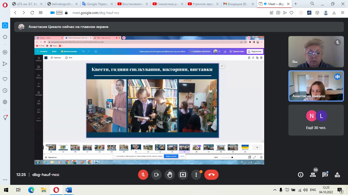 «Зміни у роботі бібліотек, спричинені російською збройною агресією» (Захватова Т. В., директор Первомайської публічної бібліотеки, М’ячина Т. М., директор Нововодолазької публічної бібліотеки, Сургай Н. В., директор Валківської публічної бібліотеки, Рудевська М. О., директор