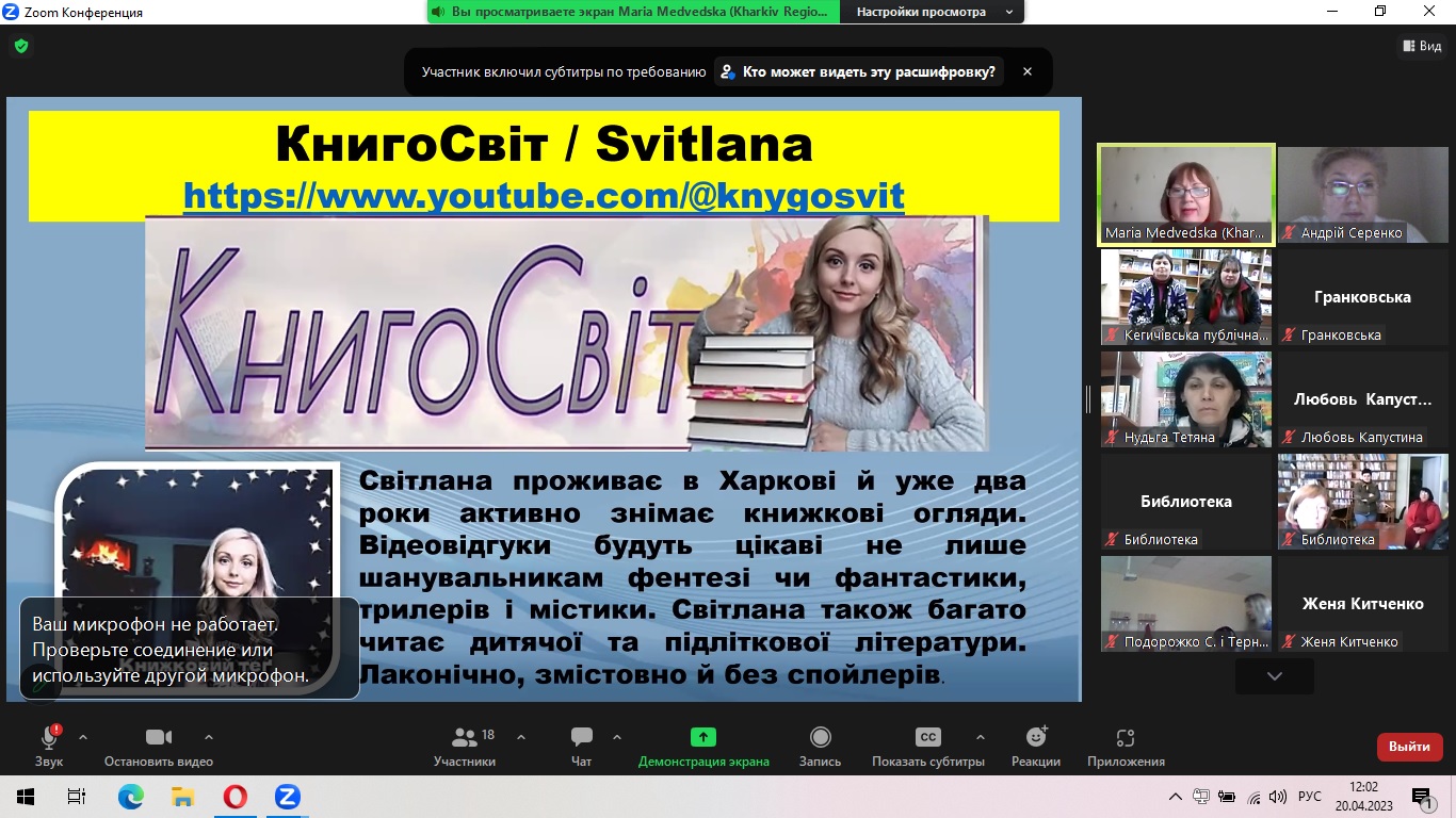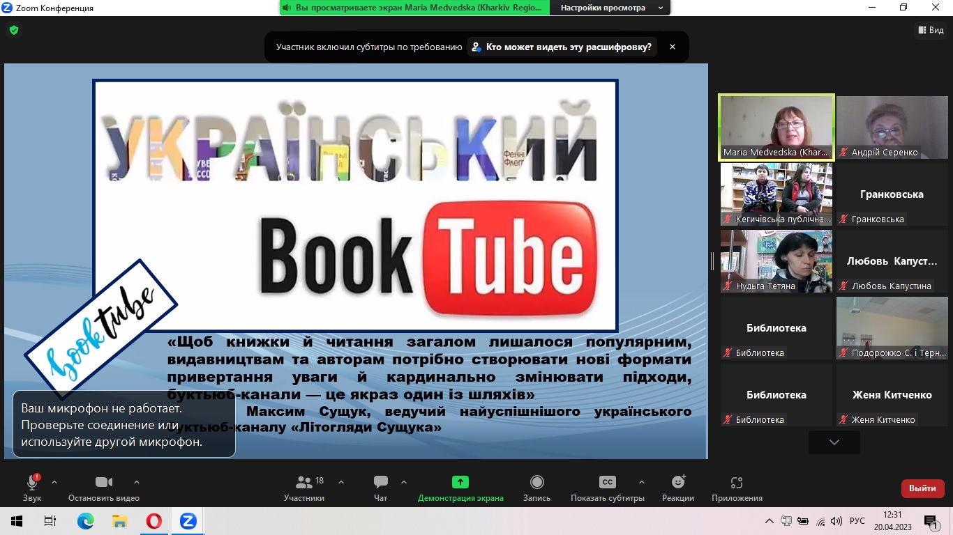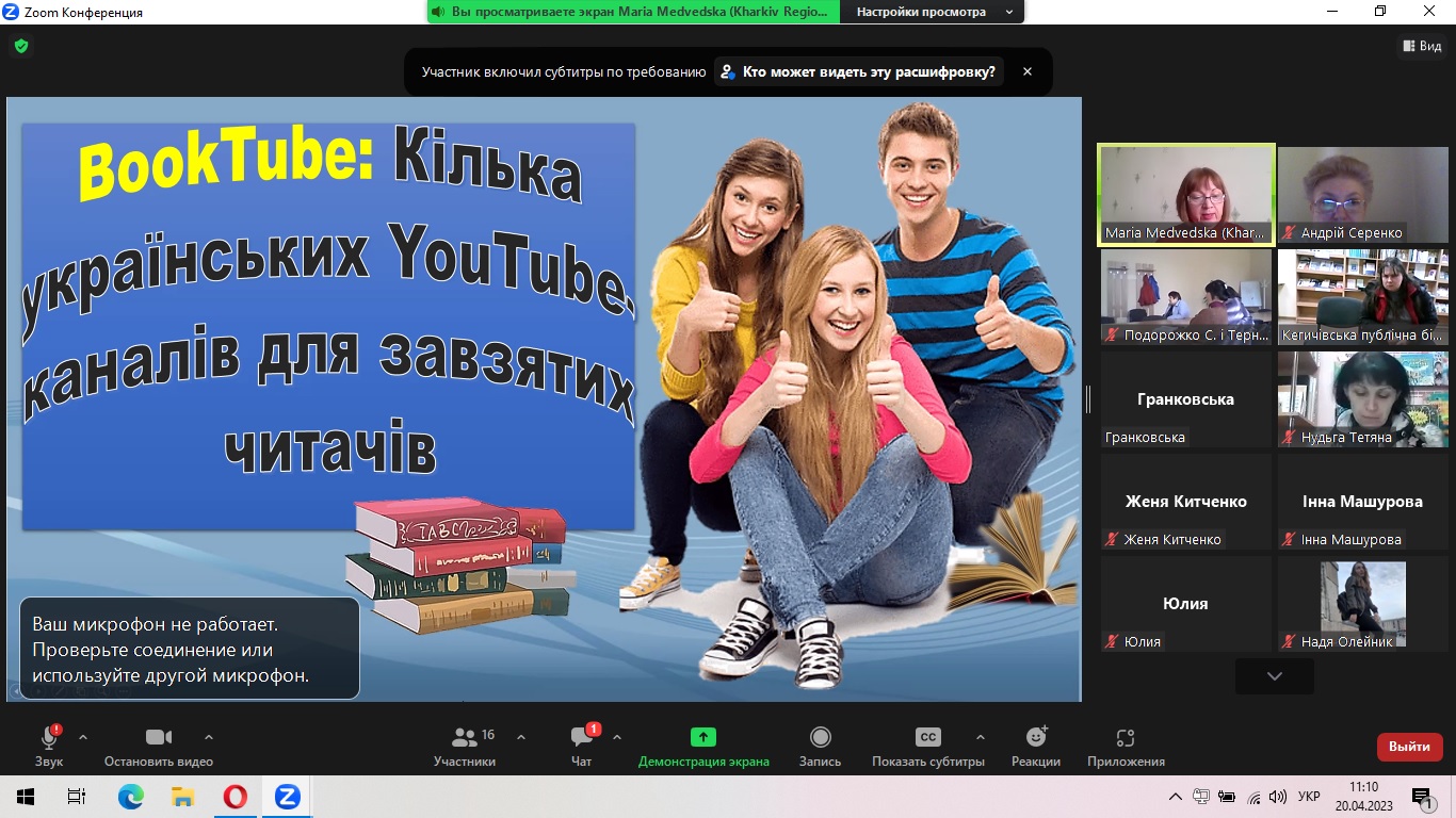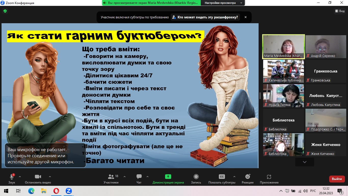 20 - 21 квітня 2023 року співробітники Центральної міської бібліотеки ім. В. Г. Бєлінського та бібліотек-філій ЦБС Шевченківського району приєдналися до веб-лекції «Буктюбери, буктокери, букстаграмери: книжкові експерти нового формату» з циклу вебінарів та онлайн-зустрічей «Бібліотечний level-up: тренди, інструменти, практики». Веб-лекція складалася з двох частин. Перша лекція «Буктюбери» відбулася 20 квітня, друга лекція «Буктокери, букстаграмери» - 21 квітня, на платформі Meta.