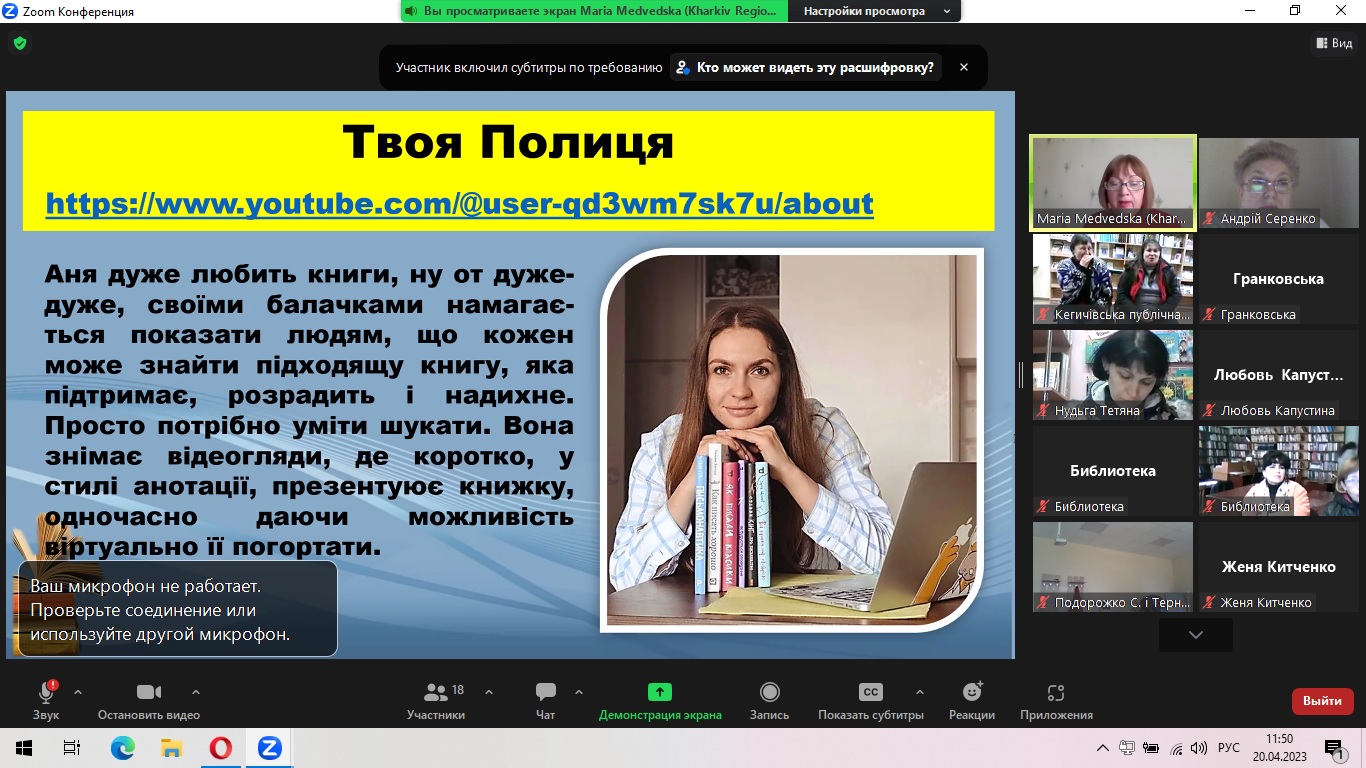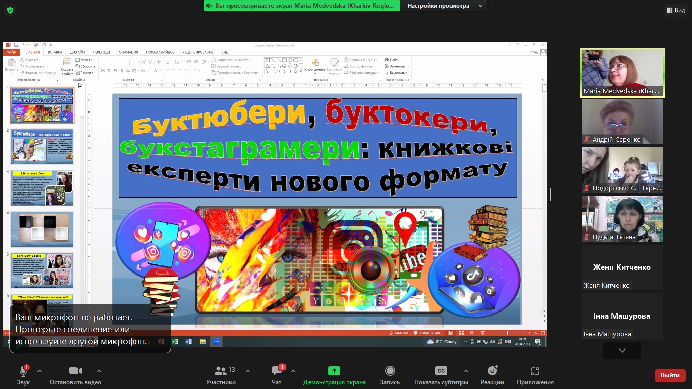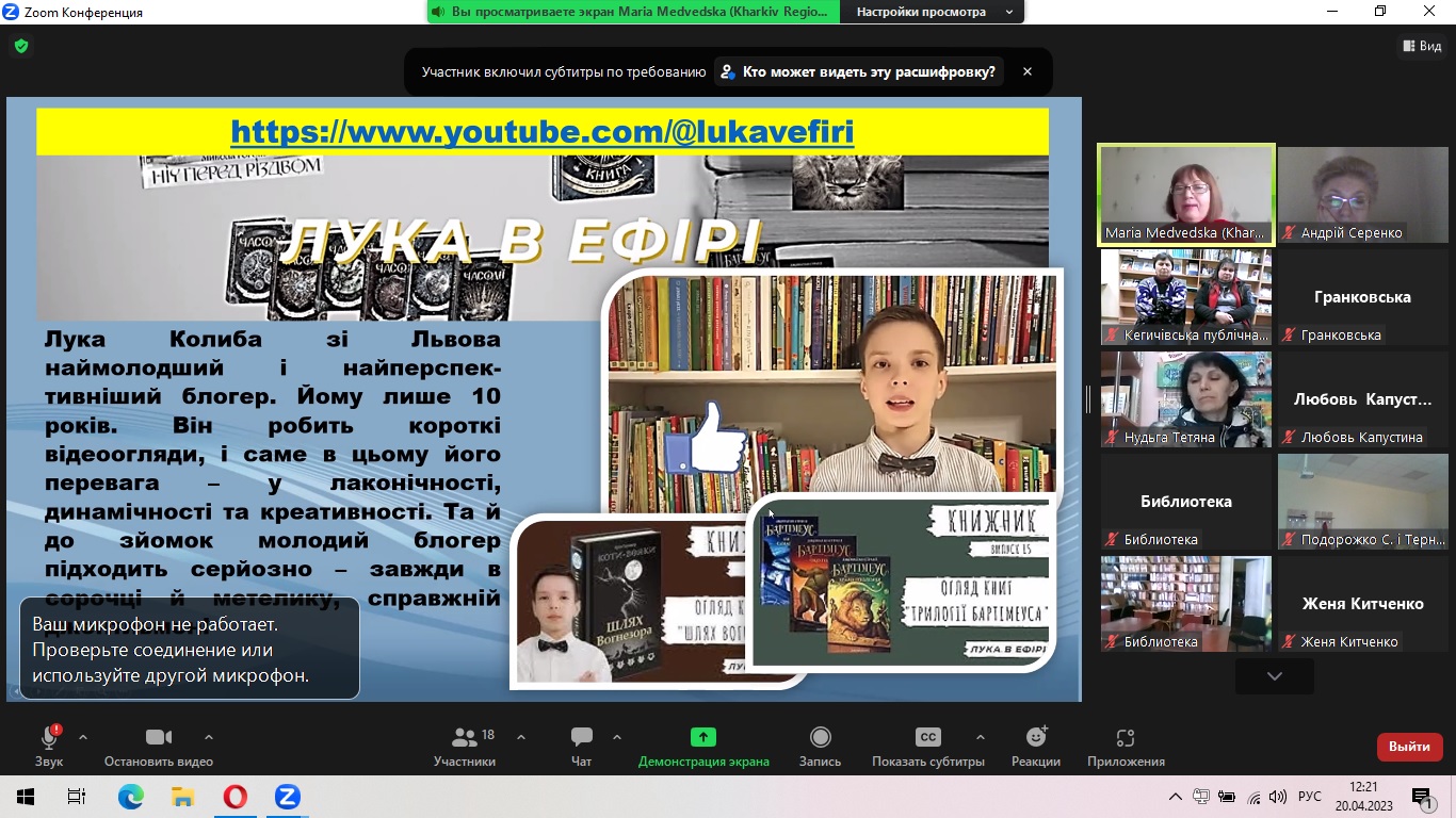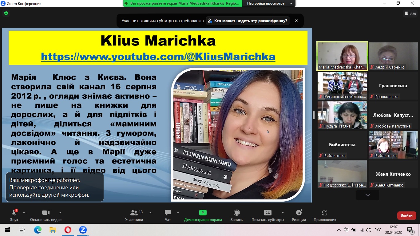 20 - 21 квітня 2023 року співробітники Центральної міської бібліотеки ім. В. Г. Бєлінського та бібліотек-філій ЦБС Шевченківського району приєдналися до веб-лекції «Буктюбери, буктокери, букстаграмери: книжкові експерти нового формату» з циклу вебінарів та онлайн-зустрічей «Бібліотечний level-up: тренди, інструменти, практики». Веб-лекція складалася з двох частин. Перша лекція «Буктюбери» відбулася 20 квітня, друга лекція «Буктокери, букстаграмери» - 21 квітня, на платформі Meta.