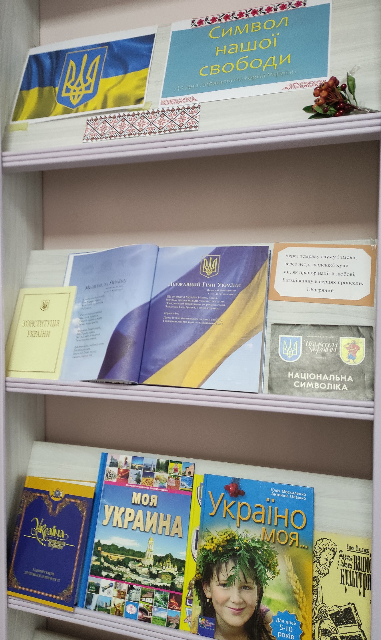 З нагоди річниці офіційного символу нашої держави в у Центральній міській бібліотеці Бєлінського працює книжкова виставка «Символ нашої свободи». На виставці представлена література українських авторів, яка висвітлює історичний розвиток України з давніх часів, історію становлення державності та незалежності, національної символіки. Ви дізнаєтеся багато цікавого про минуле нашої країни. Про факти, на які спирається історична наука і які підтверджені першоджерелами, можна отримати інформацію з представлених видань.