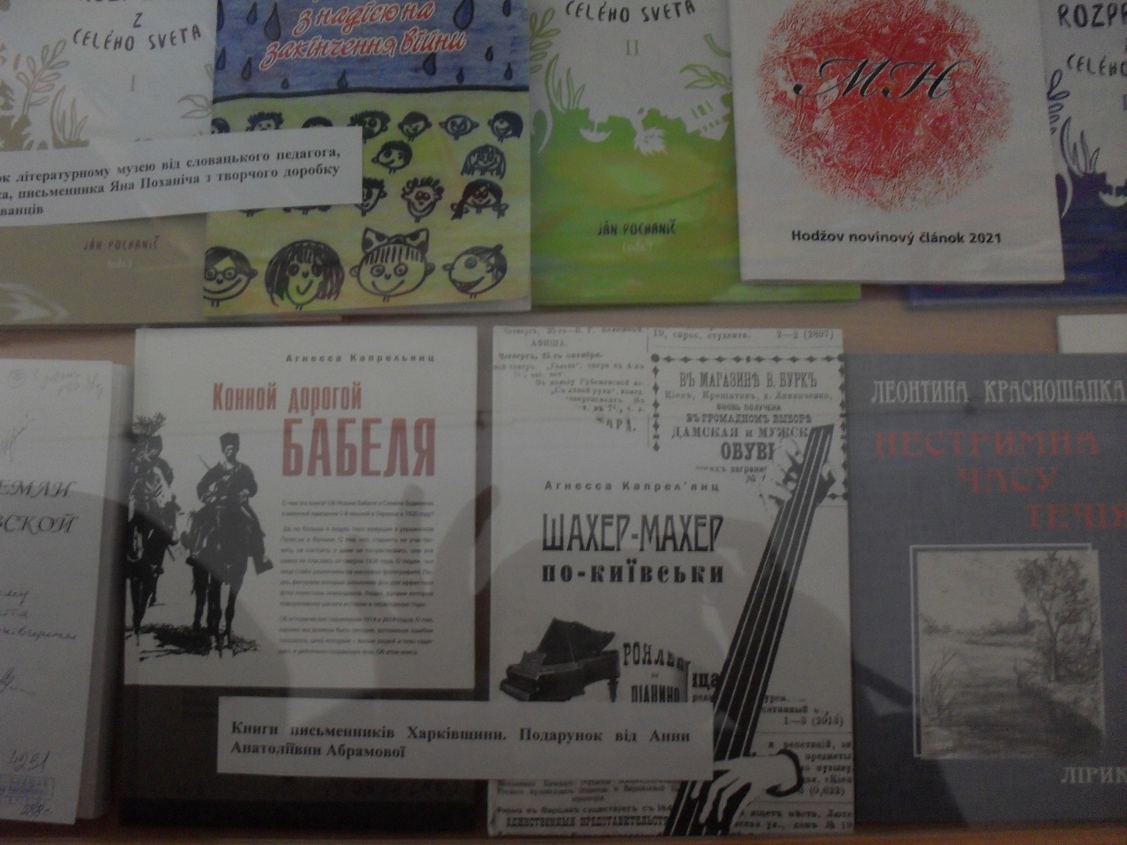 Зацікавила присутніх і книжкова виставка творів поетів та письменників Слобожанщини з фондів «Народного літературного музею Закарпаття», які були подаровані музею авторами в 2022-2024 рр. під назвою «…І в час воєнної негоди писемна нива наша родить!».