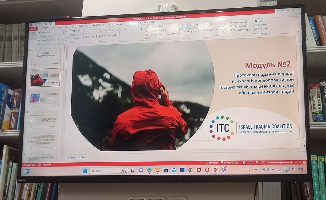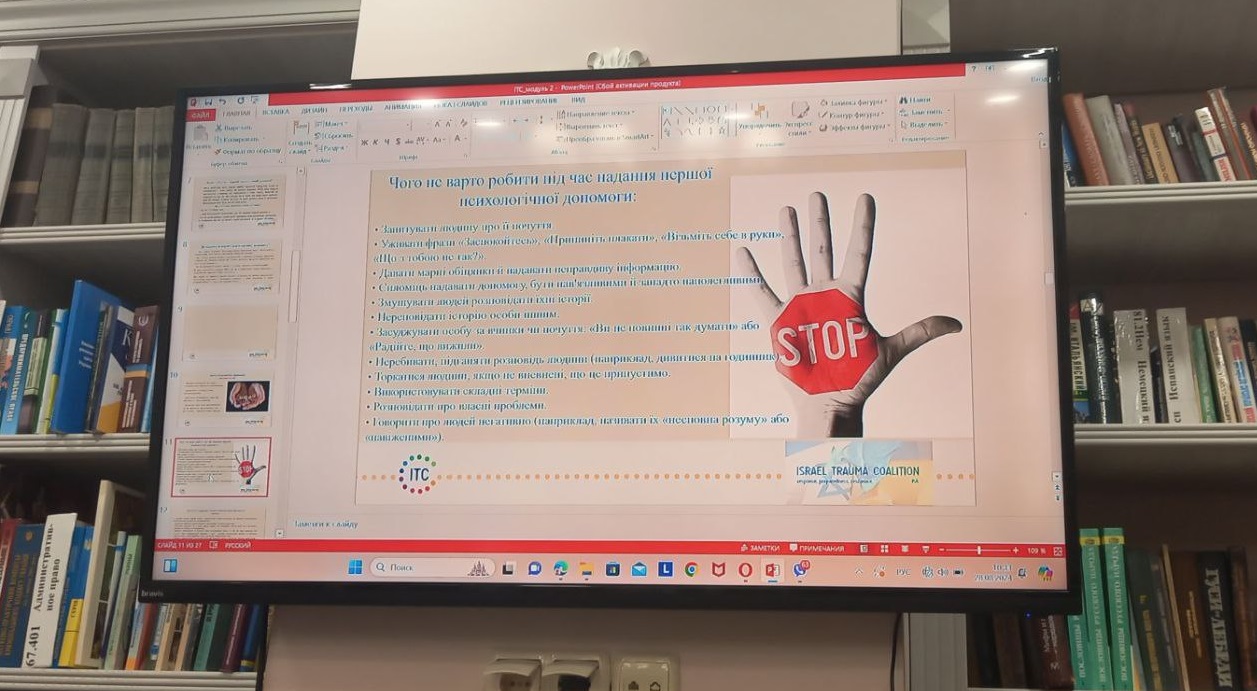 Тренінг провела досвідчена психологиня Лариса Вікторівна Кондрацька. Вона детально розповіла про протоколи надання першої психологічної допомоги при гострих психічних реакціях, які можуть виникнути у людей, що пережили стресові події.