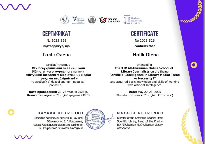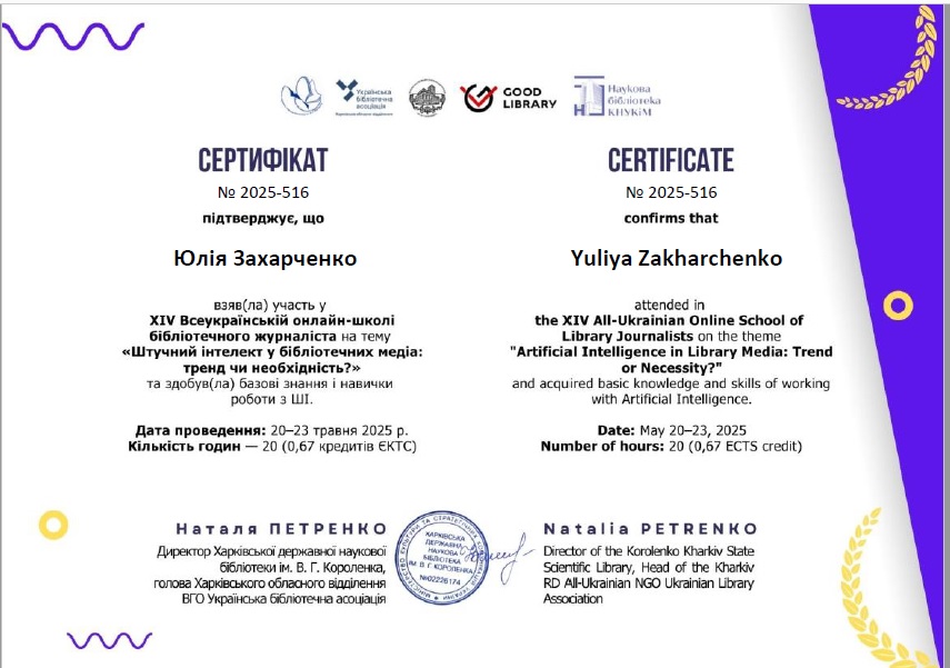 Навчатися - це відкривати нові можливості! Тому працівники Центральної міської бібліотеки взяли участь у XIV Всеукраїнській онлайн-школі бібліотечного журналіста «Штучний інтелект у бібліотечних медіа: тренд чи необхідність?», яка проходила 20-23.05.2025 року на платформі Zoom.