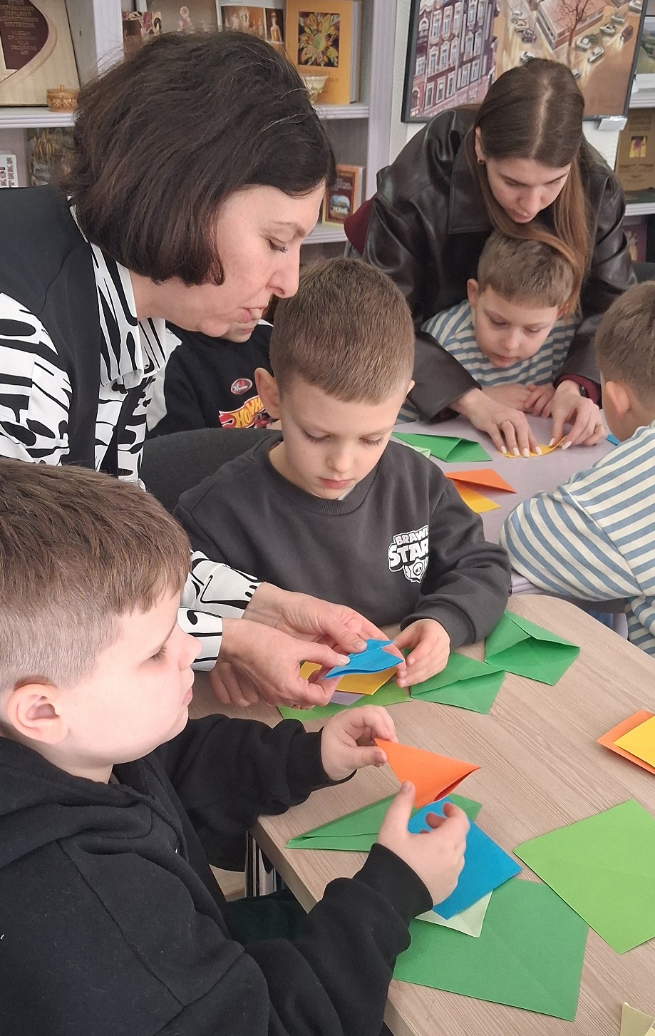 Озброївшись знаннями, малята взялися до справи. Їхні умілі ручки старанно запрацювали, створюючи оригамі-квіти. Діти намагалися ретельно наслідувати свою наставницю, адже хотіли виготовити саме такі паперові первоцвіти. Допомагали малюкам «чаклувати» з яскравим папером студенти, майбутні бібліотекарі. В підсумку вийшов оригінальний яскравий весняний квітник.