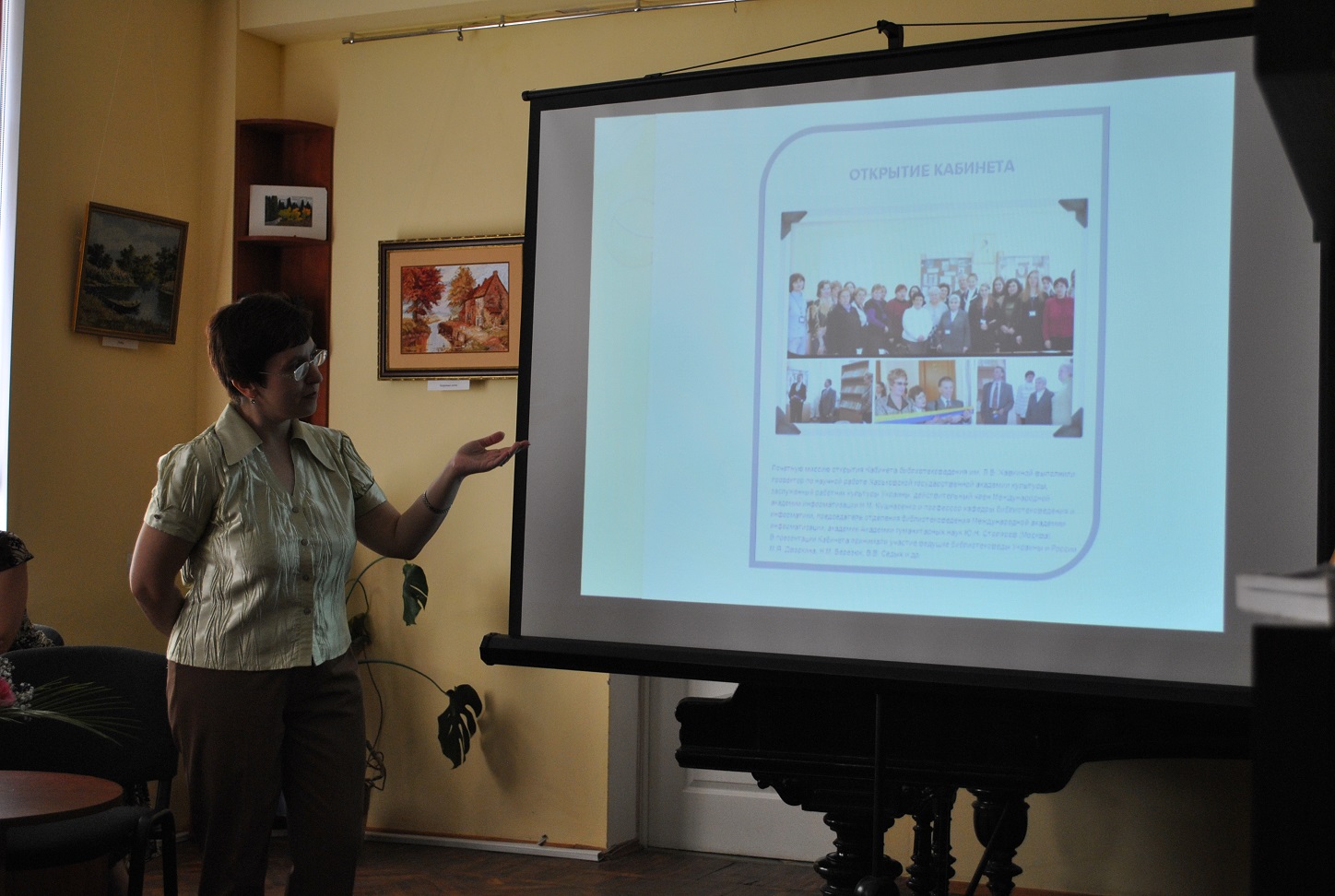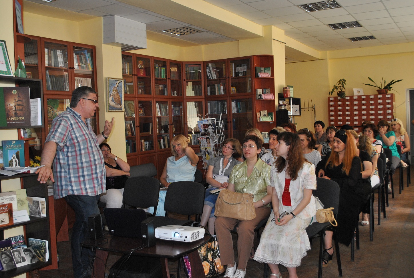 У залі зібралися співробітники публічних бібліотек міста, перед основною темою, з цікавістю прослухали повідомлення Скорик Олени Петрівни, завідуючої сектором кабінету бібліотекознавства ХДНБ ім. В. Г. Короленка, про історію створення та розвитку регіонального інформаційного центру з бібліотечної справи - кабінету бібліотекознавства ім. Л. Б. Хавкіної, який був заснований в 1903 році. Зараз кабінет бібліотекознавства є центром професійних комунікацій. Тут регулярно проходять творчі зустрічі читачів і колег-бібліотекарів, проводяться лекції, екскурсії, презентації бібліотечних видань. Фонд кабінету налічує більше 9 тис. документів з дисциплін соціально-комунікативного циклу, а також має унікальну колекцію бібліотекознавчих видань кінця XIX-початку XX століття. Основна категорія користувачів - бібліотечні фахівці, а також викладачі та студенти Харківської академії культури. Відеоролик «Історія становлення і розвитку традицій відділу бібліотекознавства в ХДНБ ім. В. Г. Короленка» розміщений на сайті ХГНБК, тут же співробітники бібліотек можуть знайти віртуальні виставки, присвячені українським діячам культури, інтерактивний плакат до 110-річчя з дня заснування кабінету і переглянути бібліотечні відеоогляди і віртуальні екскурсії.
